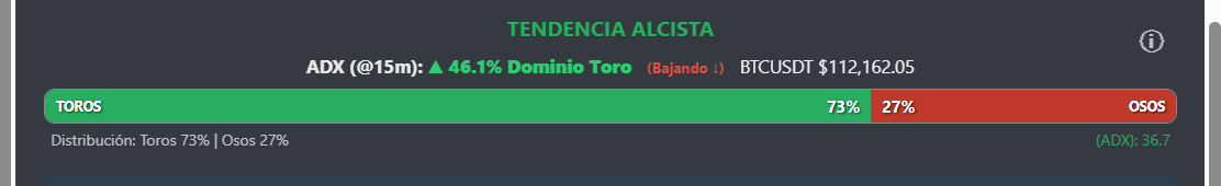 El ADX no mide la dirección de la tendencia, sino su **fuerza**. Un ADX alto (generalmente por encima de 25) indica una tendencia fuerte (ya sea alcista o bajista). Un ADX bajo sugiere un mercado en rango o sin una tendencia clara. Este módulo te ayuda a determinar si es un buen momento para operar a favor de la tendencia o si debes esperar.