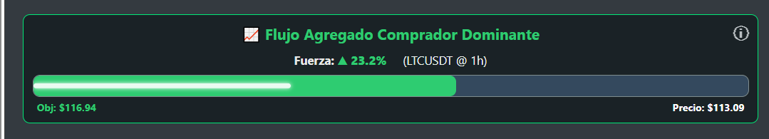 Este módulo compara la fuerza del volumen acumulado (OBV) con la fuerza del precio. La barra de color (verde/roja) representa la posición del OBV en su rango reciente, mientras que la línea blanca representa al precio. Cuando la barra de color es mucho más grande que la línea del precio, indica una fuerte presión (de compra si es verde, de venta si es roja) que el precio aún no refleja completamente, sugiriendo un posible movimiento futuro hacia el "Precio Objetivo".